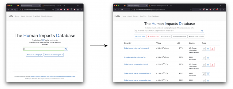 Depuis plusieurs décennies, des scientifiques du monde entier mesurent, recensent et publient des données quantifiant les activités humaines et l’évolution de notre environnement. Ces études ont clairement démontré que nous avons un impact non négligeable sur notre planète 1, que ce soit sur la composition de l’atmosphère 23, le niveau des eaux 4, la taille des glaciers 56, ou encore la diminution de certaines ressources naturelles 78. Au cours du temps ces études s’accumulent, et avec elles toujours plus de données, rapportées par des organismes variés (universités, industries, gouvernements), dans différentes régions, avec des unités variables, voire des protocoles de mesure distincts. À l’ère des Big Data, il devient de plus en plus difficile de comparer les résultats obtenus par un nombre croissant d’études scientifiques. Pour autant, ces mêmes données sont cruciales pour quantifier l’impact des activités humaines sur notre planète, les rendre accessibles et compréhensibles pour la population générale, et aussi permettre aux gouvernements de prendre des décisions éclairées de développement durable. C’est l’objectif que se sont fixés les auteurs de Anthroponumbers.org, le site qui héberge la Human Impacts Database 9 : rassembler les mesures quantitatives de l’impact des activités humaines sur notre planète, issues de sources et organismes variés, les convertir dans un unique système d’unités, le tout rassemblé sur une base de données ergonomique et accessible à tous.
