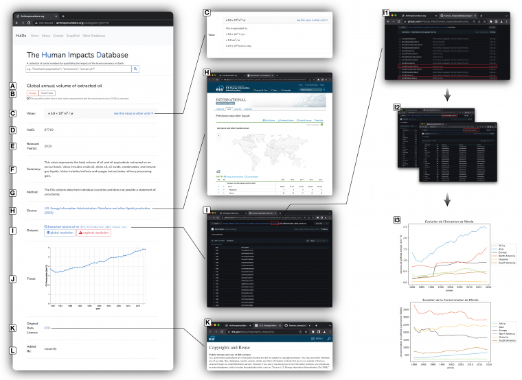 Fiche représentative sur l’extraction mondiale annuelle de pétrole. Chaque fiche contient (A) un titre ; (B) une catégorie et une sous-catégorie ; (C) la valeur la plus récente dans les unités internationales, avec des conversions dans plusieurs unités si nécessaire ; (D) un code de référence, qui figure dans l’adresse web de la page ; (E) l’année de mesure de la valeur ; (F) un résumé présentant les données ; (G) la méthode employée pour obtenir ces données ; (H) la source de ces données et son lien ; (I) un lien pour accéder et télécharger les données sous forme de tableau ; (J) un aperçu graphique des données ; (K) une déclaration de la licence de partage des données ; (L) le nom de l’administrateur·rice ayant généré la fiche. (I1-I3) Les administrateur·rice·s de l’HuID mettent à disposition les données soigneusement rapportées dans différents tableaux uniformisés que tout utilisateur peut visionner, télécharger, puis utiliser pour ses propres recherches. Par exemple, l’utilisateur peut visualiser toutes les données disponibles sur la production et consommation de différents types d’énergies (I1), télécharger les tableaux de données temporelles et régionales sur le pétrole (I2), et tracer l’évolution de l’extraction de pétrole par continent pour la comparer à la consommation de pétrole par personne et par continent (I3).