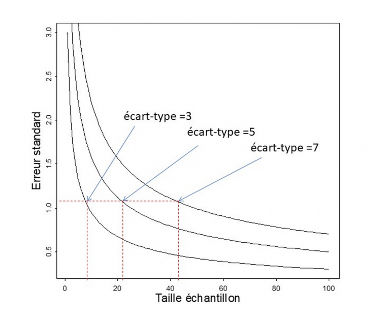 Il est important de noter que la formule présentée ci-dessus (Équation $\eqref{erreurstandard}$) fait aussi intervenir l’écart-type de la distribution de la variable étudiée dans la population cible et cela en numérateur. Cela a pour conséquence que pour une même taille d’échantillon, une estimation sera moins précise dans une population hétérogène sur la variable mesurée que dans une population homogène.