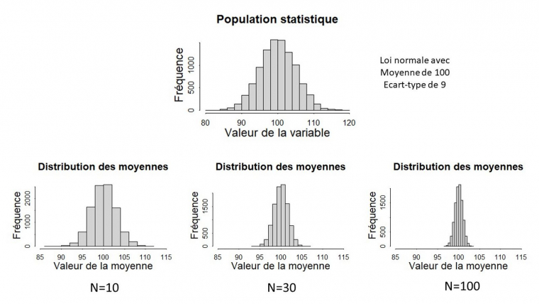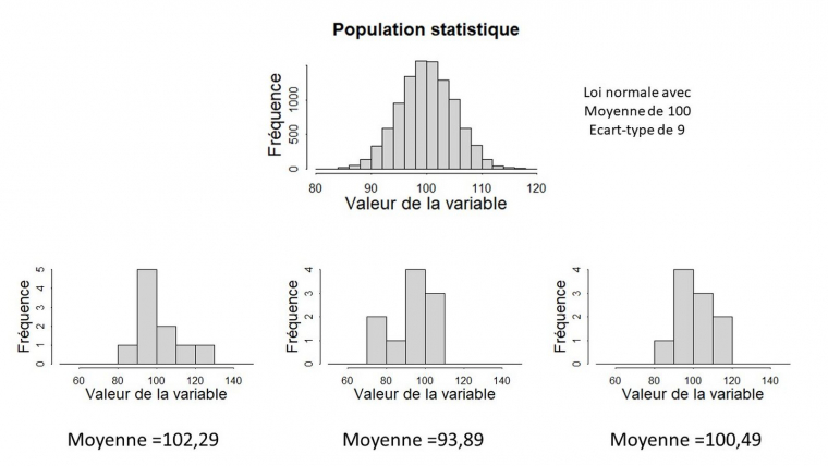 La distribution réelle de la variable dans la population statistique est présentée en haut (moyenne de 100, écart-type de 9) et les trois échantillons en bas. Tous les échantillons ont des moyennes différentes, toutes ces moyennes diffèrent de la vraie moyenne de la population.