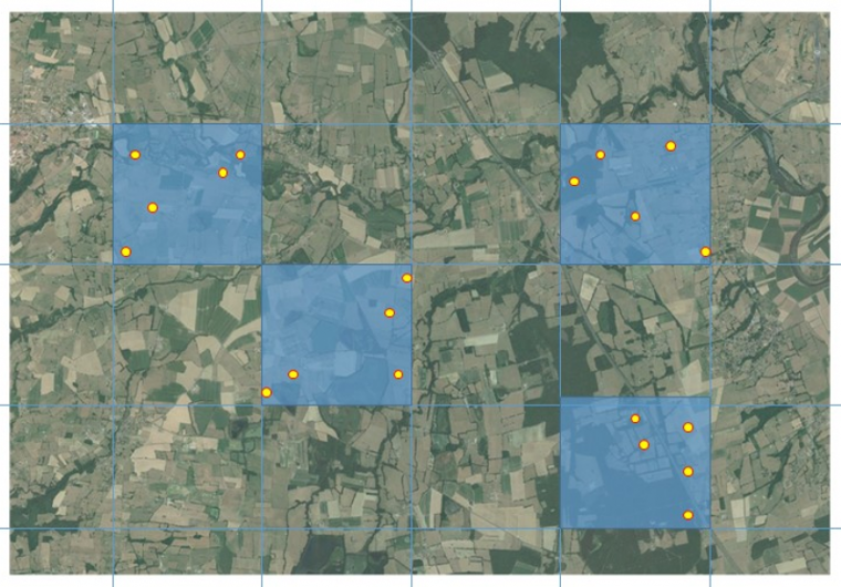 Une grille est posée sur la zone d’étude et des mailles de cette grille sont tirées aléatoirement. Au sein de ces mailles, cinq points de prélèvements sont tirés aléatoirement. L’extrapolation se fera à l’échelle de la zone couverte par la photographie. Ce plan fournira en complément des informations sur la variabilité spatiale (intramaille et intermaille) de la variable mesurée.