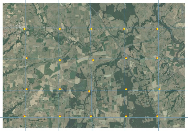 Les points sont répartis aux intersections d’une grille qui couvre l’entièreté de la zone d’étude. L’extrapolation se fera à l’échelle de la zone couverte par la photo.