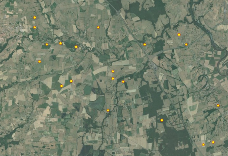 La figure 7 présente un plan d’échantillonnage pour mesurer des densités de vers de terre dans des sols. Il repose sur deux niveaux d’échantillonnage : des mailles et des points au sein des mailles. Une grille est posée sur la zone d’étude définissant des unités d’échantillonnage de grande taille. On réalise un tirage aléatoire de mailles au sein de cette grille, le nombre de maille tiré correspond au nombre de matinées disponibles pour réaliser les mesures sur le terrain. Au sein de chaque maille, un tirage aléatoire est réalisé pour déterminer la localisation des cinq points sur lesquels seront effectués les prélèvements de vers de terre. Les unités d’échantillonnage sont de fait les points de prélèvements, la population statistique l’ensemble des points de la zone d’étude. La sélection des points de prélèvements étant basé sur un (même deux) tirage(s) aléatoire(s), les données peuvent être analysées avec des statistiques inférentielles. Ce plan présente deux avantages : (i) d’un point de vue pratique, le fait de sélectionner un ensemble de points au sein d’une même maille assure de ne pas perdre trop de temps en déplacements et de pouvoir échantillonner plusieurs points au sein d’une même matinée, (ii) l’emboîtement des échelles spatiales permet d’estimer la variabilité intramaille et la variabilité intermaille, ce qui peut être intéressant pour comprendre comment se structure la variable d’intérêt dans l’espace.