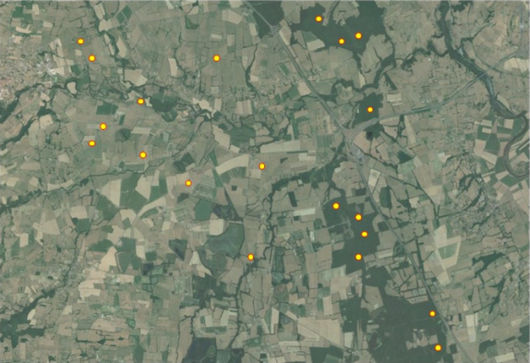Les points sont répartis en deux strates : une rassemblant les milieux boisés, l’autre rassemblant les milieux ouverts. L’extrapolation se fera à l’échelle de la zone couverte par la photo, en pondérant les estimations de chaque strate par leur ratio de surfaces au sein de la zone.