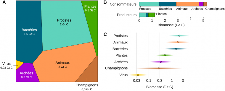 Les estimations de biomasse ont été réalisées sur sept groupes d’êtres vivants : Animaux, Plantes, Champignons, protistes, Bactéries, Archées et virus.