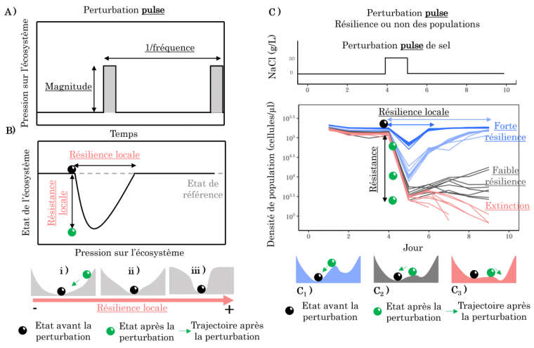 Il convient de noter que la définition de la stabilité locale est dépendante du type de perturbation s’appliquant sur l’écosystème 2. Un choc de sel plus long ou plus fort changerait la résilience et la résistance locales mesurées pour les mêmes populations de levures. Ainsi, la comparaison de la stabilité des écosystèmes à des perturbations ne peut se faire que lorsqu’ils sont soumis aux mêmes perturbations.