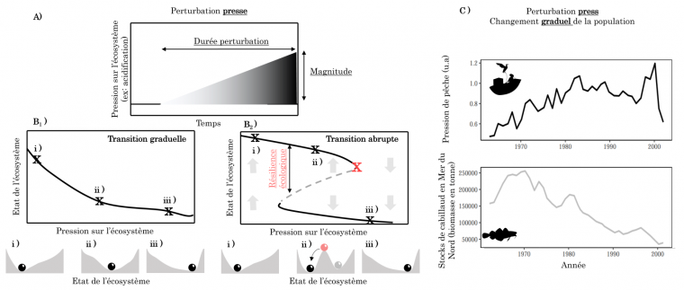 D’un autre côté, certaines perturbations modifient en continu l’abondance des espèces dans un écosystème ou bien la disponibilité en ressources. Ces perturbations, nommées « presse », peuvent être décrites par deux paramètres : leur durée et leur magnitude (Figure 2A). Par exemple, la pression de pêche diminue en continu les stocks de poissons (Figure 2B), l’acidification des écosystèmes aquatiques cause le blanchissement des coraux 2, et l’invasion d’une espèce peut modifier la composition des communautés locales 34.
