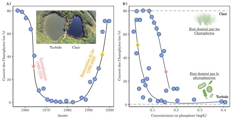 Dans les années 60, le lac Veluwe est passé d’un état oligotrophe, pauvre en nutriments, à eutrophe, riche en nutriments, suite à une augmentation des apports de phosphore (flèche rose). Cet apport de nutriments a stimulé la croissance du phytoplancton qui, en rendant l’eau turbide, a freiné la croissance des Charophytes. Dans les années 90, des efforts de restauration (réduction du nombre de poissons et de l’apport en phosphore ; flèche orange) a permis de restaurer le lac vers un état oligotrophe avec une eau claire, un contrôle du phytoplancton et une forte abondance des Charophytes. Le fait que la concentration en phosphore au-dessus de laquelle le lac s'est eutrophisé et que la concentration en dessous de laquelle il a été restauré ne soient pas les mêmes suggère l’existence d’une hystérèse (voir partie 3). Données issues de 12.