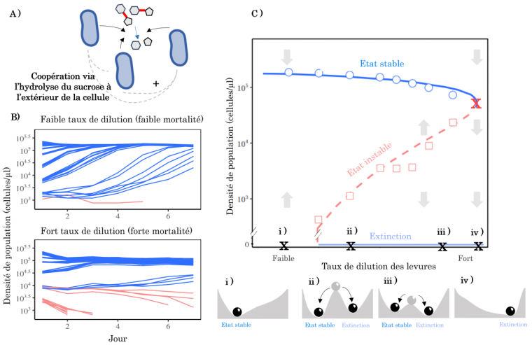 Illustrons ce concept avec un exemple expérimental. Chez les levures, la source de carbone vient principalement de sucres simples (glucose et fructose). Lorsque les levures se développent dans un milieu contenant du saccharose, elles l’hydrolysent à l’extérieur de la cellule via la sécrétion d’une invertase et importent le fructose et le glucose dans leur cellule 1. Parce que l’hydrolyse se fait en dehors de la cellule, la majorité des monosaccharides issus de l’hydrolyse diffuse dans le milieu et bénéficie à toutes les autres levures. À l’échelle d’une population, cela crée une dynamique de coopération entre cellules : chaque levure sécrète des invertases qui sont indirectement bénéfiques aux autres (à l’image des populations de suricates dont la surveillance par quelques individus bénéficie à toute la population ; Figure 5A). Cette dynamique de coopération permet aux levures d’avoir une croissance supérieure de 40 % quand l’abondance de la population est importante par rapport à lorsqu’elle est faible. Pour étudier l’effet d’un tel mécanisme de coopération sur les dynamiques de populations de levures, des auteurs ont cultivé différentes populations, chacune avec un taux de dilution quotidien différent (Figure 5B) 2. Plus le taux de dilution est élevé, moins les levures bénéficient de la coopération pour l’hydrolyse du saccharose, et donc plus leur taux de mortalité est élevé. La figure 5B présente deux exemples de dynamiques temporelles de populations de levures exposées à un taux de dilution faible ou élevé, pour différentes abondances initiales dans le milieu de culture. À faible taux de dilution, la plupart des populations ont des abondances qui augmentent jusqu’au septième jour de l’expérience (courbes bleues). À fort taux de dilution, plusieurs populations ayant une faible abondance initiale s’éteignent en quelques jours (courbes rouges). Répliquée pour différents taux de dilution, cette expérience montre que l’abondance des populations diminue petit à petit à mesure que le taux de dilution augmente, jusqu’à ce qu’une valeur seuil soit atteinte (croix rouge sur la Figure 5C). Au-delà de ce seuil, l’abondance de la population devient trop faible pour maintenir un niveau de coopération suffisant pour permettre à la population de persister : la population s’effondre brutalement.