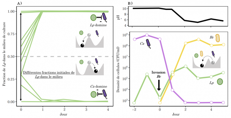 A. Lorsque deux espèces avec des optimums de pH différents sont mises en cocultures, deux états alternatifs peuvent être obtenus en fonction l’espèce qui domine initialement le milieu de culture. Par exemple lorsque Lactobacillus plantarum (Lp) est initialement en faible abondance dans le milieu de culture, Corynebacterium ammoniagenes (Ca) l'exclut du milieu en rendant le pH plus alcalin.