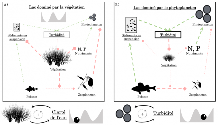 De la même manière, dans l’exemple des lacs peu profonds, la présence de Charophytes réduit la turbidité de l’eau via la stabilisation des sédiments (Figure 7A). En retour, la croissance des Charophytes est favorisée par une eau claire, car la lumière pénètre plus facilement la colonne d’eau et stimule la photosynthèse. De plus, la présence des Charophytes inhibe la possibilité d’un développement du phytoplancton par deux mécanismes. D’une part, ces végétaux offrent un habitat de refuge au zooplancton (comme les daphnies) lui permettant d’échapper à la prédation par les poissons. Ainsi protégé, le zooplancton se nourrit du phytoplancton ce qui limite le développement de ce dernier. D’autre part, comme les Charophytes utilisent les nutriments présents dans les sédiments et la colonne d’eau, ceux-ci ne sont pas disponibles pour le phytoplancton. Mis bout-à-bout, ces différents mécanismes tendent à maintenir un état dominé par la végétation via des boucles de rétroactions positives : plus il y a de végétation, moins il y a de sédiments en suspension et moins il y a de phytoplancton (Figure 7A).