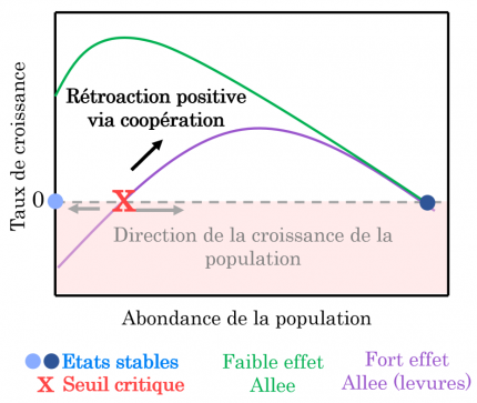 L’effet Allee décrit une rétroaction positive entre les individus constituant la population via leur coopération dans le cadre d’accès aux ressources, de défense contre les prédateurs ou d’accès à la reproduction. Lorsque cet effet Allee est fort, les populations en faible abondance ont un taux de croissance négatif, car il y a trop peu d’individus pour une coopération efficace ce qui conduit à l’extinction de la population. Il y a donc une abondance seuil qui sépare la zone où le taux de croissance est négatif, de celle où le taux de croissance est positif (état instable). Au-dessus de ce seuil, le taux de croissance augmente jusqu’à ce que la compétition intraspécifique devienne dominante et conduise à une baisse du taux de croissance. La population finit alors par atteindre un état d’équilibre illustré par le point bleu foncé.