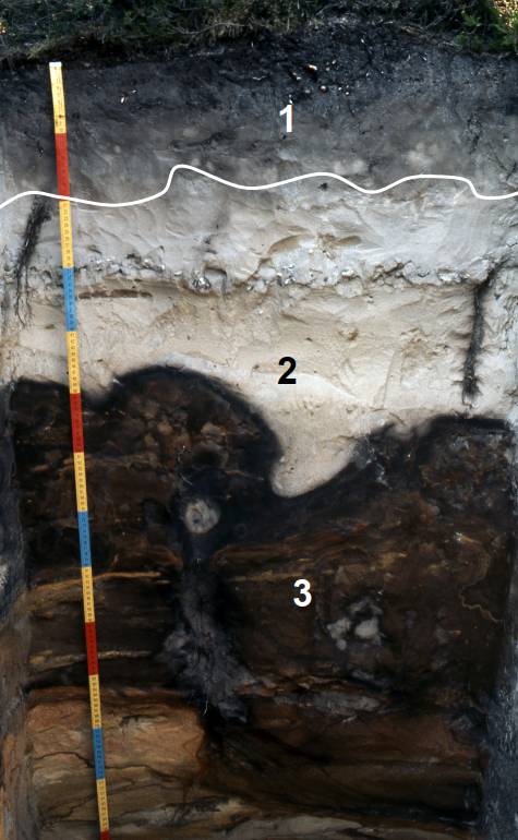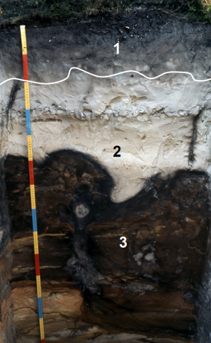 1 : horizon A, sablo-organique ; 2 : horizon E, complètement sableux, hormis la silice tous les éléments ont été entraînés en profondeur ; 3 : horizon B, d’accumulation, légèrement cimenté par les oxydes de fer et les complexes organo-minéraux.