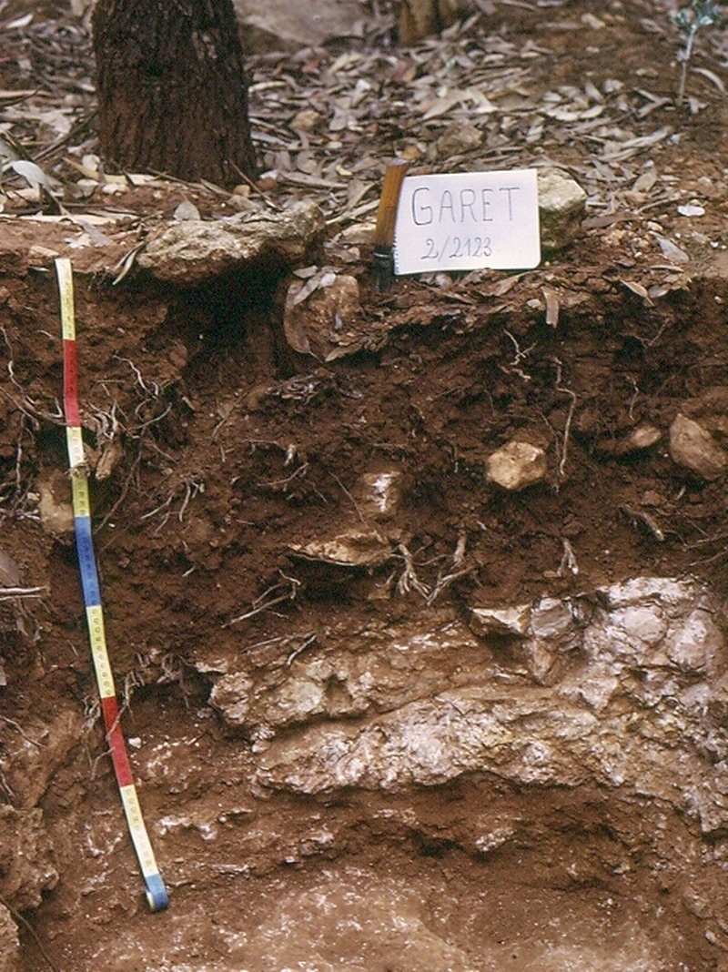 Les horizons superposés subhorizontaux d’un sol calcaire moyennement différencié sur calcaire lacustre (étage Stampien), Peyriac-sur-Mer, département de l’Aude, France.