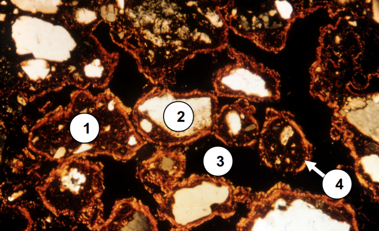 1 : assemblage riche en argile et limon ; 2 : grains de squelette ; 3 : vides ; 4 : revêtements argileux issus du lessivage des niveaux supérieurs dans le sol.