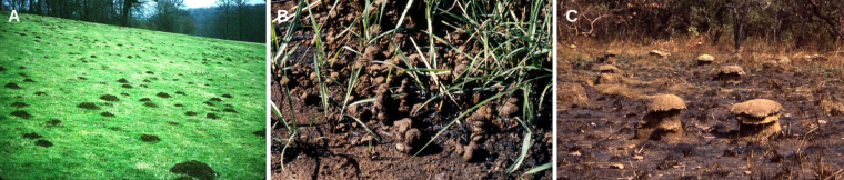 B : Les turricules manifestent à la surface du sol une très forte activité des vers de terre. Zone tropicale, République centrafricaine.