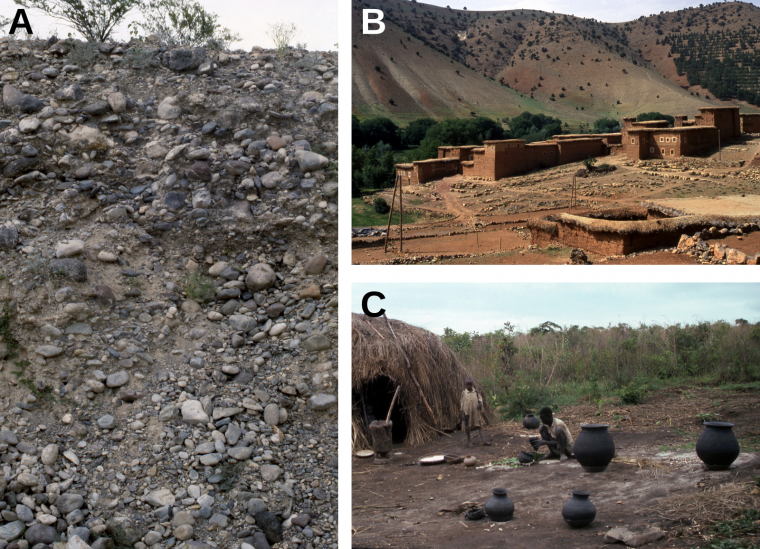 B : Au Maroc, dans le Haut-Atlas (vallée de l’Aït Bouguemez), village construit avec des matériaux limono-argileux extraits du sol.