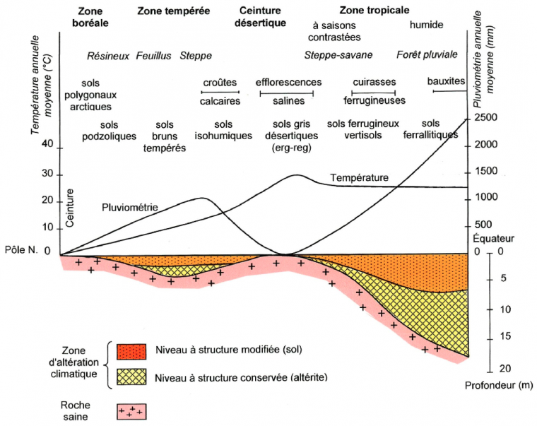Selon le climat et l’âge de la couverture pédologique, on constate que la profondeur de l’altération est très différente : l’épaisseur des horizons à structure modifiée d’une part et celle des altérites d’autre part sont maximales en régions tropicales et équatoriales. Cette épaisseur est nulle ou très réduite dans les déserts.