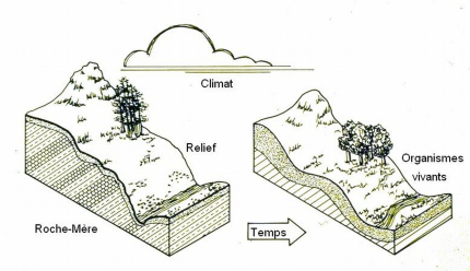 Globalement, dans le contexte climatique assez homogène de la France métropolitaine, c’est le matériau parental qui par son rôle de frein ou d’accélérateur, règle le jeu de la pédogenèse, avec toutefois une limite en ce qui concerne les variations d’altitude. Lorsque le climat devient plus froid et plus humide, en haute montagne, l’activité pédogénétique est nettement ralentie ; c’est alors qu’apparaissent des formations particulières propres aux régions froides et humides.