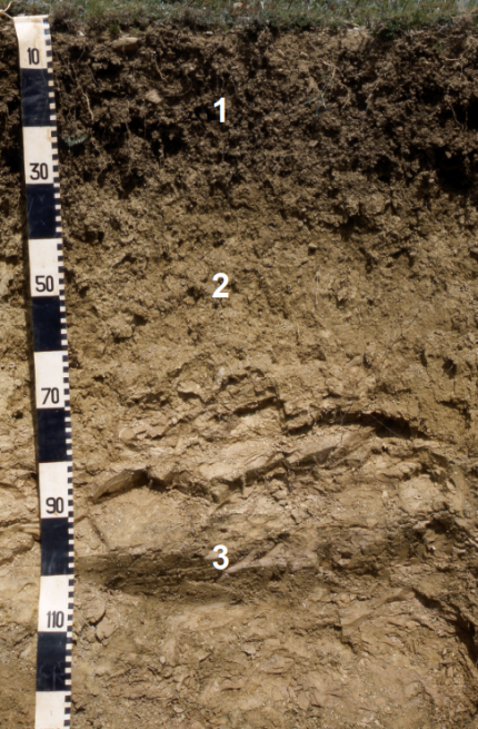 1 : horizon A argilo-humifère. ; 2 : horizon B, altération et décarbonatation ; 3 : horizon C, roche calcaire altérée et désagrégée.