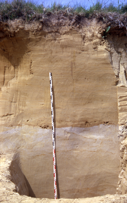Les horizons de ce sol ne sont pas tous horizontaux. Podzol très différencié. Lande de Versigny, département de l’Aisne, France.