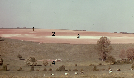 Pédopaysage en Thiérache montrant une toposéquence avec limons des plateaux (1), argile à silex de décarbonatation (2), craie à silex du Crétacé (3) et colluvions (4). Marfontaine, département de l’Aisne, France.