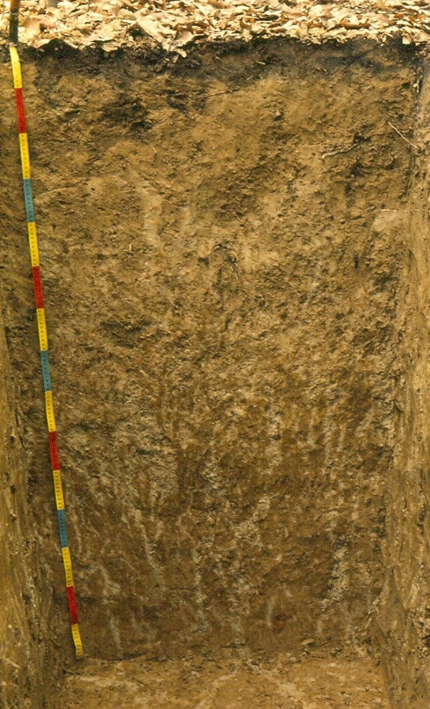 Dans la plupart des cas, la profondeur est d’environ 1,50 m à 1,80 m. Grâce à cette fosse, le pédologue va pouvoir faire des observations morphologiques et des prélèvements pour l’analyse en laboratoire (les boîtes sur le côté de la fosse servent à emporter les échantillons prélevés).