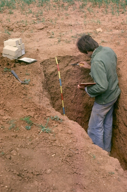 Le pédologue creuse une fosse d’une profondeur variant selon les circonstances agronomiques (profondeur d’enracinement de la culture) ou naturelles (apparition de la roche mère sous-jacente) ou ses propres préoccupations (moyen en temps, en matériel…).