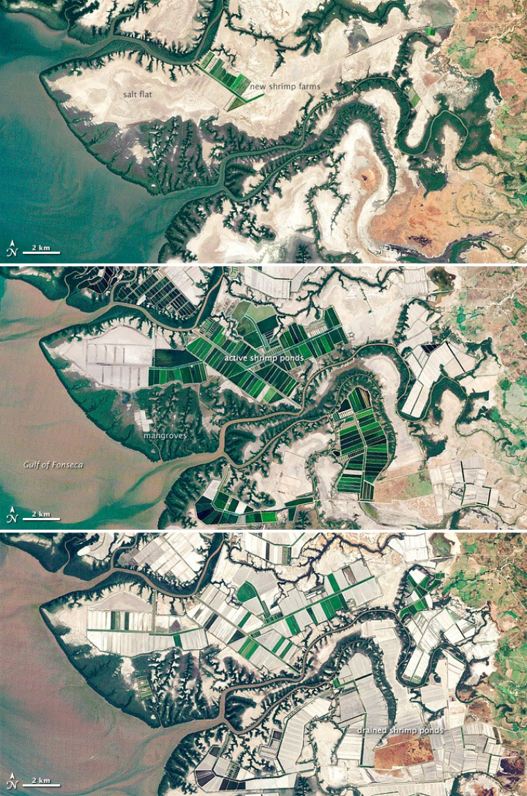 Sur ces images satellites, les mangroves apparaissent en vert foncé et bordées de brun. Ces images montrent un développement très rapide de l’aquaculture, qui s’accompagne d’une dégradation progressive des écosystèmes naturels et d’une pression croissante sur les mangroves. La différence de couleur des eaux du Golfe est probablement due aux marées : les images ont été acquises à marée basse en 1999 et 2011, et à marée plus haute en 1986.