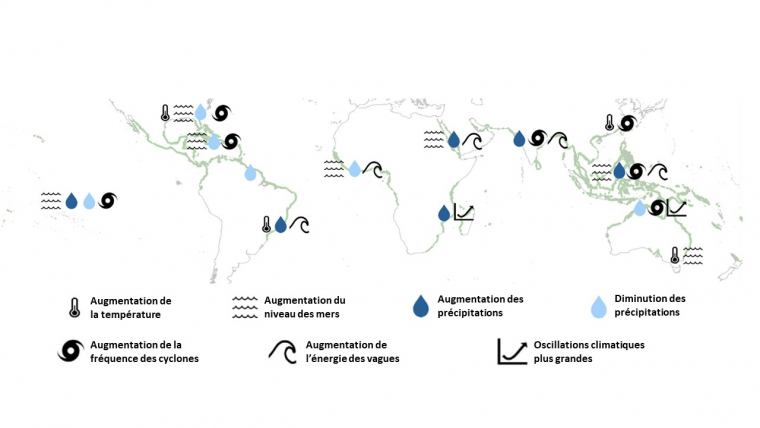 L’avenir des mangroves sera également conditionné par le changement climatique dont l’ampleur et les conséquences vont continuer de s’intensifier. Ses effets sur les mangroves sont multiples, et parfois antagonistes.