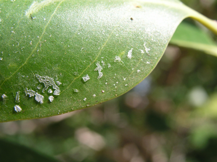 Par ailleurs, l’observation des feuilles de certaines espèces de palétuviers révèle la présence de cristaux de sel à leur surface (Figure 3). Ces cristaux résultent de l’excrétion du sel par l’arbre via des glandes présentes au niveau de ses feuilles 89. C’est un des multiples mécanismes qui permettent aux palétuviers de vivre malgré la richesse en sel du milieu, toxique pour la plupart des végétaux en raison du stress osmotique qu’il induit au niveau des cellules 10.