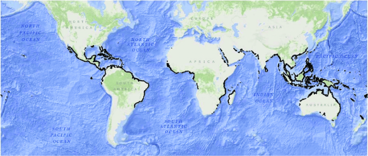 Les données satellitaires les plus récentes estiment la superficie totale des mangroves à environ 147 000 km² 1, ce qui représente « seulement » un quart de la superficie de la France métropolitaine. Bien que cette superficie soit relativement restreinte, les mangroves s’étendent sur près de 75 % des rivages des régions tropicales et subtropicales de la planète, formant une fine interface entre les écosystèmes terrestres et marins (Figure 2), généralement de quelques centaines de mètres à plusieurs kilomètres de largeur 2.