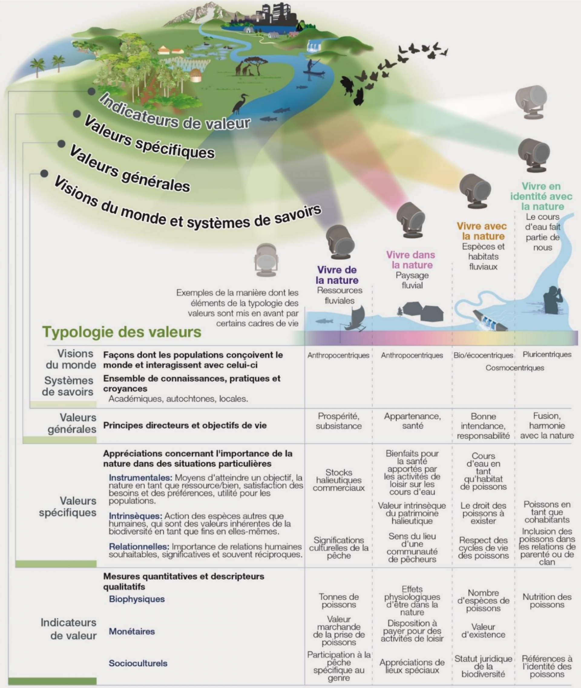 Les cercles concentriques illustrent les différents types et dimensions de valeurs (vision mondiale, valeurs générales et spécifiques, contributions de la nature à l’environnement, etc.). Ces dimensions ne s’excluent pas mutuellement puisque les individus ou les groupes peuvent attribuer plusieurs valeurs. Ces valeurs dépassent largement le cadre des services ou des contributions de la nature aux humains.