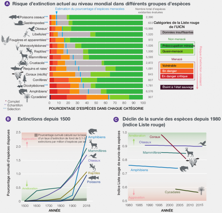 B. Extinctions d’espèces de vertébrés depuis 1500. Dans le cas des reptiles et des poissons, les taux n’ont pas été évalués pour toutes les espèces.