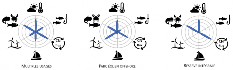 Les services sont les suivants : attractivité de l’environnement pour les activités récréatives (voilier), régulation de la qualité du milieu via le maintien des cycles biogéochimiques (flux de carbone et d'azote), approvisionnement en ressources pour la nutrition (hameçon et poissons), régulation climatique (thermomètre, soleil et nuage), maintien du cycle de vie, des habitats et de la diversité génétique (crabe, baleine et poisson), et approvisionnement en énergie (éoliennes).