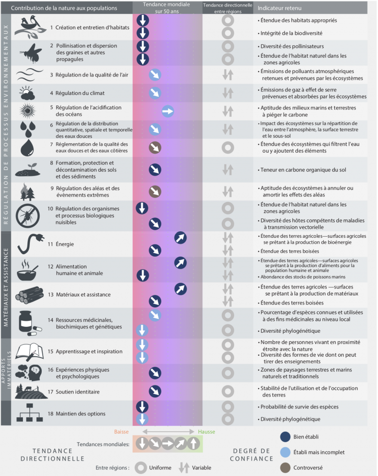 L’IPBES a choisi de remplacer le terme « service » par « contribution de la nature aux populations ». De la même façon, l’IPBES a choisi de renommer les catégories CICES : « régulation des processus environnementaux » au lieu de « régulation et maintien », « matériaux et assistance » à la place de « services d’approvisionnement » et « apports immatériels » pour désigner les « services culturels ».