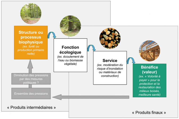 Dans ce modèle, qui fonctionne comme une « cascade », des éléments biophysiques et leur structure, par exemple la présence d’une forêt et sa composition (quelles essences d’arbres, en quelle abondance, quelle structure du sous-bois…), assurent une fonction écologique, par exemple la production de bois (« biomasse végétale ») ou de champignons. Cette fonction devient un service dès lors, et uniquement quand, elle correspond à une demande d’au moins une partie de la société, en ce sens qu’un bénéfice peut être tiré de cette fonction. Par exemple, la production de bois n’est un service que s’il existe des personnes qui ont besoin de bois de construction ou de chauffage. Le bénéfice est alors le bâtiment ou la chaleur obtenus par l’usage de ce bois.