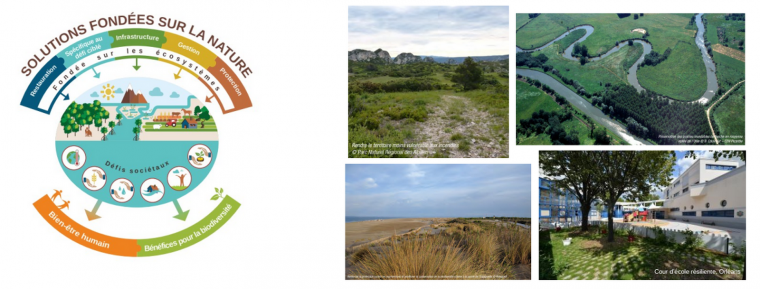 À gauche, une représentation schématique des défis auxquels doivent répondre ces solutions. À droite, quatre cas concrets de mises en œuvre de ces solutions : réouverture des massifs forestiers des Alpilles pour prévenir les risques d’incendie, restauration de prairies inondables en vallée d’Oise pour limiter les inondations en milieu urbain, protection et végétalisation des dunes de la pointe de l’Espiguette pour prévenir les submersions marines et ralentir le recul du trait de côte et réduction des îlots de chaleur et des inondations par la végétalisation d’une cour d’école à Orléans.