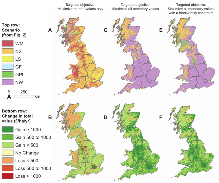 Les auteurs de l’étude ont défini trois objectifs alternatifs : (i) approche conventionnelle maximisant les valeurs marchandes uniquement (A et B) ; (ii) maximisation de la valeur de tous les services écosystémiques qui peuvent être monétisés de manière robuste (C et D) ; (iii) maximisation de toutes les valeurs des services écosystémiques mais avec une contrainte telle qu’aucun scénario donnant une perte nette de diversité des oiseaux sauvages n’est autorisé dans la zone concernée (E et F). Les différents scenarios de changements d’usage des terres sont : WM : « marchés mondiaux » (politique et réglementation environnementales affaiblies sauf si elles bénéficient à la production agricole ; ce scénario aboutit à un développement urbain essentiellement) ; NS : « sécurité nationale » (augmentation de la production agricole nationale au détriment des politiques et réglementations environnementales ; ce scénario aboutit à la conversion des terres à faible valeur agricole en zones boisées) ; LS : « gestion locale » (politiques agro-environnementales renforcées par l’extension de zones pour la conservation ; ce scénario aboutit au renforcement des mesures de protection sur les zones d’importance nationale) ; GF : « suivre le courant » (politique et réglementation similaires à celles actuellement en place ; ce scénario représente la situation actuelle) ; GPL : « des terres vertes et agréables » (les politiques agro-environnementales fortes et expansion globale des terres gérées pour la conservation ; ce scénario aboutit à la création de réseaux écologiques) ; NW : « la nature au travail » (politique et réglementation en faveur de paysages multifonctionnels et le maintien des services écosystémiques ; ce scénario aboutit au verdissement des zones urbaines et péri-urbaines). Si les services d’approvisionnement, aux avantages marchands, se développent souvent aux dépens des autres services, cette étude suggère que prendre en compte la biodiversité aboutit à une plus grande valeur économique, donc des intérêts collectifs supérieurs.