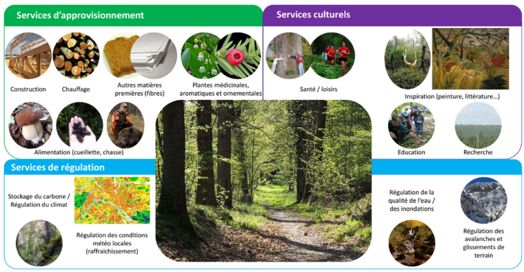 Une forêt de France métropolitaine peut fournir de nombreux services dans les trois catégories.