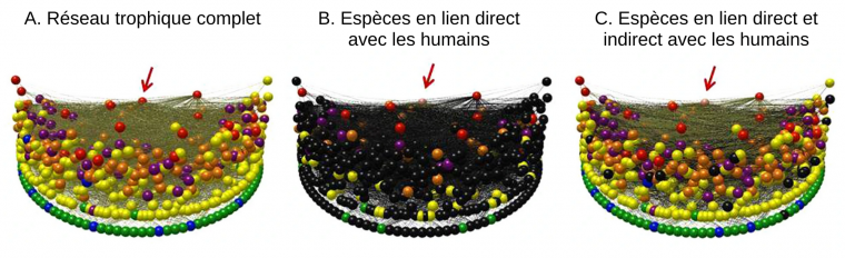 Dans ce réseau, les espèces (sphères colorées) sont ordonnées de bas en haut selon leur position dans la chaîne alimentaire, depuis les producteurs primaires en bas jusqu’aux prédateurs de sommet de chaîne en haut. Chaque trait continu reliant deux sphères représente une relation de consommation, la sphère la plus haute dans le réseau consommant la sphère la plus basse. Les humains, une population de chasseurs-cueilleurs aléoutienne, sont indiqués par la flèche rouge. Les couleurs représentent : vert = algues, bleu = divers (par exemple, détritus, protozoaires, bactéries, biofilms, lichens, plantes à fleurs marines), jaune = invertébrés, orange = poissons, rouge = mammifères, violet = oiseaux. Le réseau est très dense, donc difficile à lire, mais il représente la réalité de la complexité des interactions entre espèces et illustre la biodiversité comme « tissu vivant de la planète ». En (a), l’ensemble des espèces présentes dans l’écosystème est représenté. En (b), seules les espèces que les humains consomment sont colorées (c’est-à-dire les espèces liées aux humains par un seul lien trophique), les autres espèces sont en noir : les humains ne prélèvent qu’une petite partie des espèces. En (c), les espèces colorées sont celles reliées directement ou indirectement aux humains, par deux liens trophiques au maximum, (il peut s’agir par exemple des proies des poissons consommés par les humains). On voit nettement que les humains sont liés à la quasi-totalité des espèces présentes dans l’écosystème.