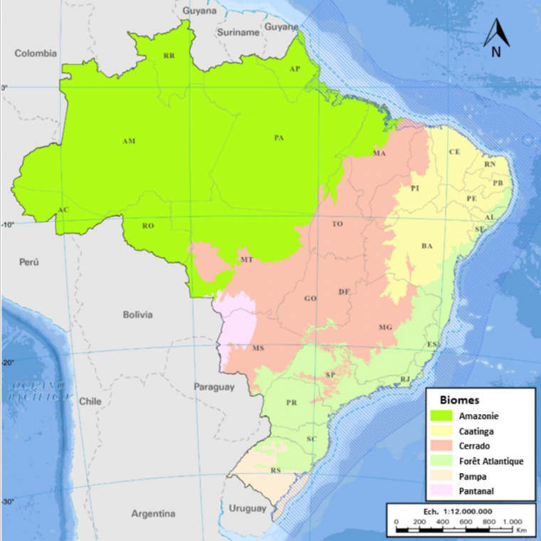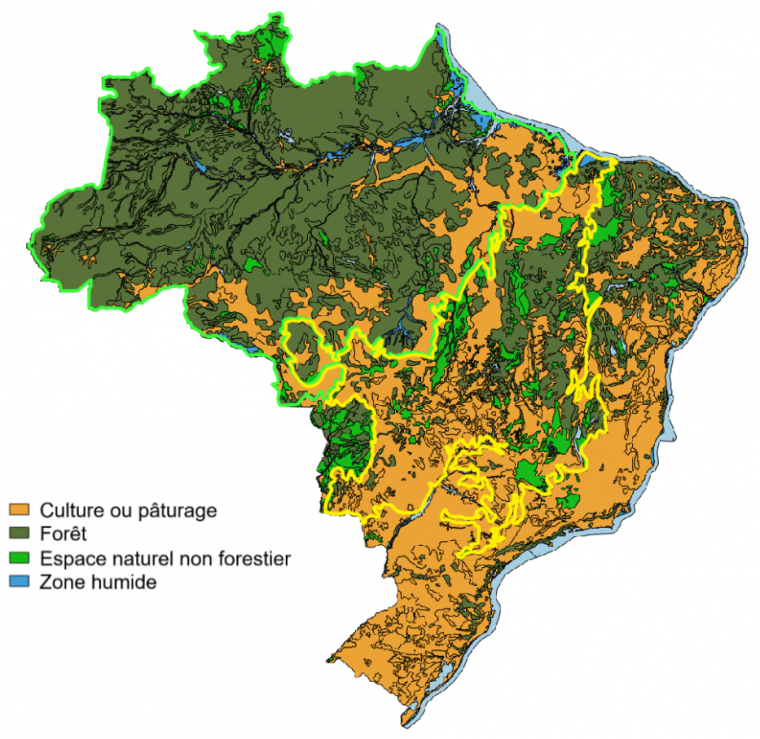 Les contours de l’Amazonie sont représentés en vert, et ceux du Cerrado en jaune. Le Cerrado (au centre du Brésil) est beaucoup plus déforesté que l’Amazonie (au nord-ouest), notamment au profit des cultures et de l'élevage de bétail.