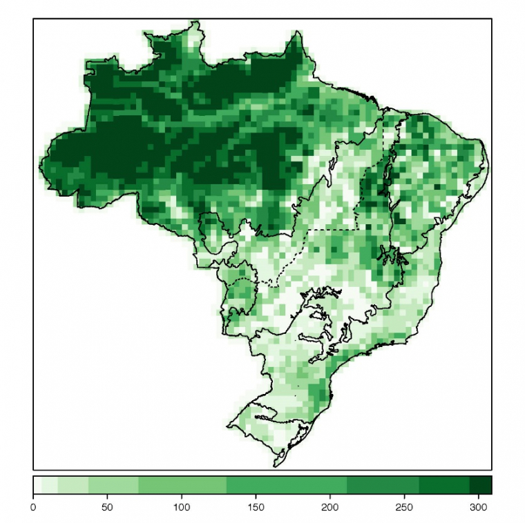 L’échelle est en milliers d’hectares par carré (un carré fait 2 500 km²). Les surfaces forestières dans le Cerrado devraient être extrêmement réduites par rapport à l’Amazonie. Les investissements REDD+ pourraient amplifier ce phénomène en privilégiant la protection de l’Amazonie, un biome plus riche en carbone que le Cerrado. À noter toutefois que certains espaces naturels du Cerrado ne sont pas comptabilisés comme des forêts (voir Figure 5) et ne sont donc pas pris en compte dans cette carte.