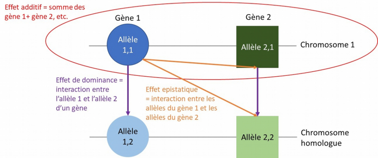L’amélioration génétique repose sur deux grands types d’effets génétiques : les effets additifs et les effets d’interaction. La figure 1 illustre ces différents effets génétiques. Un individu ne transmet que la moitié de son patrimoine génétique et donc qu’un chromosome sur les deux chromosomes homologues de chaque paire. La somme des effets des gènes transmis à la descendance s’appelle la valeur génétique additive d’un individu. En revanche, les effets d’interaction sont propres à chaque individu car ils dépendent des allèles transmis par les deux parents. Ces effets d’interaction peuvent être positifs et augmenter la performance de l’individu ou négatifs et pénaliser la performance de l’individu. En sélectionnant les meilleurs individus en race pure, l’espèce humaine a sélectionné les meilleurs effets additifs mais également sélectionné les interactions génétiques favorables à l’expression de la performance.