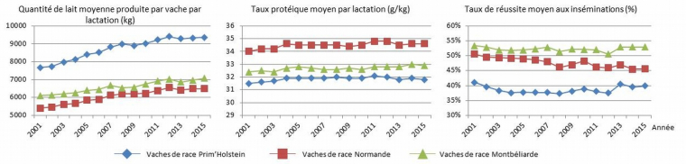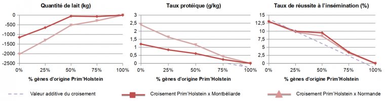 Dans notre étude (Dezetter et coll., 2015), à partir des données du contrôle de performance des vaches de races pures et issues de croisement, nous avons estimé les paramètres génétiques du croisement entre les trois grandes races laitières française (Prim’Holstein, Montbéliarde et Normande). Nous avons montré que la race Prim’Holstein est génétiquement supérieure pour le caractère de quantité de lait aux races Montbéliarde et Normande (Figure 3). Ces races sont quant à elles génétiquement supérieures pour les caractères de fertilité. Ces écarts entre races laissent présager d’une bonne complémentarité entre celles-ci. En effet, si on prend l’exemple des caractères quantité de lait et taux de conception, nous avons estimé un écart génétique additif de 1150 kg de lait sur 305 jours en équivalent adulte et un écart génétique additif de − 12 points de pourcentage de réussite à l’insémination entre les races Prim’Holstein et Montbéliarde. En prenant pour référence la Montbéliarde, la valeur génétique additive moyenne des vaches F1 issues Montbéliarde × Prim’Holstein est donc de 575 kg de lait sur 305 jours en équivalent adulte et de − 6 points de taux de conception. Les vaches F1 maintiennent donc un niveau de production de lait supérieur à la Montbéliarde tout en ayant un potentiel génétique de reproduction nettement supérieur à la Prim’Holstein.