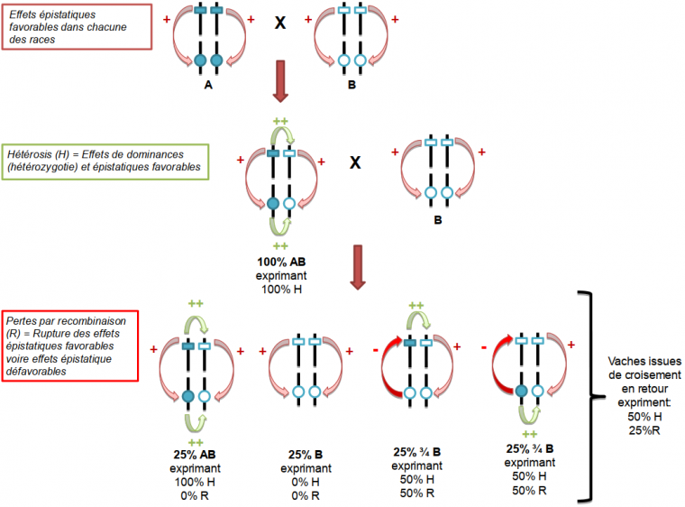 On considère l’exemple de deux parents issus de deux races homozygotes au niveau de deux loci indépendants. Aucun des deux parents n’exprime d’effet de dominance (puisqu’ils sont homozygotes) au niveau de ces deux loci. En revanche ils expriment des effets épistatiques favorables issus de la sélection (flèche rouge). Lorsque ces deux parents sont accouplés, les vaches F1 issues de ce croisement vont exprimer un effet d’hétérosis maximal. En effet, les vaches F1 possèdent les deux copies de chaque locus et donc expriment 100 % des effets de dominance (flèches vertes). Puis ces vaches F1 sont accouplées avec un taureau de la race B (c’est ce qu’on appelle un croisement en retour). En moyenne, les vaches issues de cet accouplement n’expriment plus que 50 % de l’effet d’hétérosis observé chez les vaches F1 (4 flèches vertes sur 8 interactions de dominance possible), et vont exprimer 25 % de pertes par recombinaison suite à la rupture d’interactions favorables entre les deux loci (flèche rouge accompagnée d’un −).