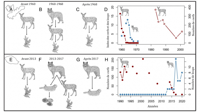 Les ressources marines ont une influence sur les relations proie-prédateur après l’introduction du loup et sa colonisation du territoire. A, B, C et D concernent l’île du Couronnement. E, F, G et H concernent l’île Pleasant.