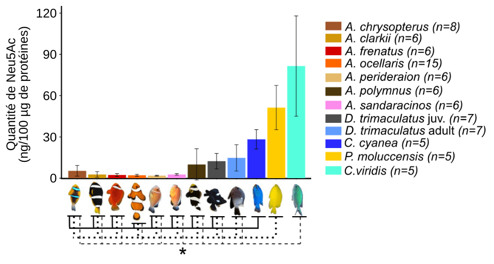 Les spécimens étudiés ont été échantillonnés en milieu naturel. Sept espèces sont des poissons-clowns vivant avec des anémones (Amphiprion chrysopterus, A. clarkii, A. frenatus, A. ocellaris, A. perideraion, A. polymnus et A. sandaracinos), une espèce, la demoiselle à trois points (Dascyllus trimaculatus) vit également avec des anémones et a été étudiée au stade juvénile et au stade adulte ; les trois autres, appartenant comme les premières à la famille des Pomacentridés, n’entretiennent pas de relations mutualistes avec les anémones (Chrysiptera cyanea, Pomacentrus moluccensis et Chromis viridis). L’astérisque indique les différences statistiquement significatives. Figure adaptée de 1.