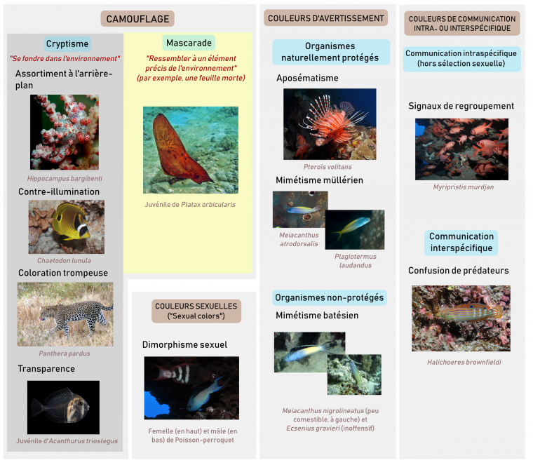 À l’époque, on pensait ainsi que les couleurs avaient été créées pour l’agrément visuel qu’elles procuraient ou qu’elles étaient le résultat d’une exposition prolongée à la chaleur ou à la lumière (Caro, 2017). À l’inverse, en allant à l’encontre de la pensée victorienne dominante, Wallace proposa pour la première fois une classification fonctionnelle des rôles biologiques des couleurs. Il définit ainsi cinq grandes catégories de couleurs pour les Animaux et les Plantes : les couleurs de protection, les couleurs d’avertissement, les couleurs sexuelles, les « couleurs typiques » et les couleurs d’attraction (uniquement chez les Plantes et chez les Insectes). Ces grandes catégories ont depuis été affinées, mais elles restent encore largement valables aujourd’hui. Nous proposons ci-dessous une version moderne de la classification effectuée par Wallace.