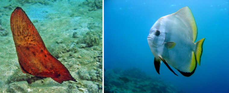 Outre le cryptisme (« l’individu se fond avec un élément du décor, le rendant moins détectable »), la mascarade (masquerade) est un autre type de camouflage où la proie est bien détectée par le prédateur, mais où ce dernier ne la reconnait pas car elle ressemble à un objet de l’environnement (Stevens et Merilaita, 2009 ; Skelhorn et coll., 2010). Par exemple, les juvéniles d’une espèce de poisson corallien, Platax orbicularis, ressemblent à des feuilles mortes ou à des débris végétaux (Figure 5).